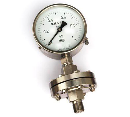 膜片壓力表的作用原理是基于彈性元件(測量系統(tǒng)上膜片)變形。膜片壓力表在被測介質(zhì)的壓力作用下,迫使膜片產(chǎn)生相應的彈性變形---位移,借助連桿組經(jīng)傳動機構(gòu)的傳動并予放大,由固定于齒輪上的指針逐將被測值在度盤上指示出來。